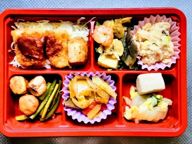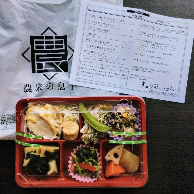 そこで、今年から利用することにしたのが、配食サービスです。「農家の息子」という名前でブランド展開している札幌の会社で、前からよくデパ地下などでお惣菜を買ってました。こんなふうにレジ袋にお弁当とその日のお品書きを入れて、宅配してくれます。