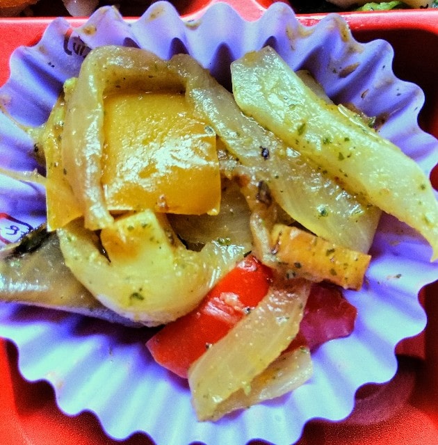 パプリカは自分で買うと一色だけで済ませてしまいますが、少しづついろんな食材を摂れるのがお弁当のいいところですね。