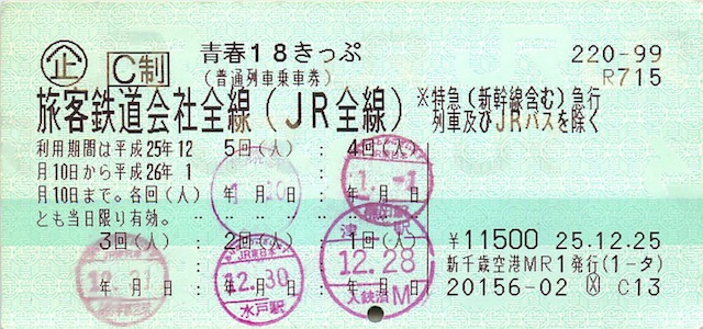 説明が難しいので、10年前に使った切符の画像をご覧ください。1枚の切符に改札で日付入りのスタンプを押してもらいます。私は1人で5回使ったので、5日分が乗り放題でした。5日間連続で使わなくてもいいんです。12月28日に三重県の津駅から利用を開始し、翌年の1月20日に札幌・余市間の日帰り旅行で使い終わりました。