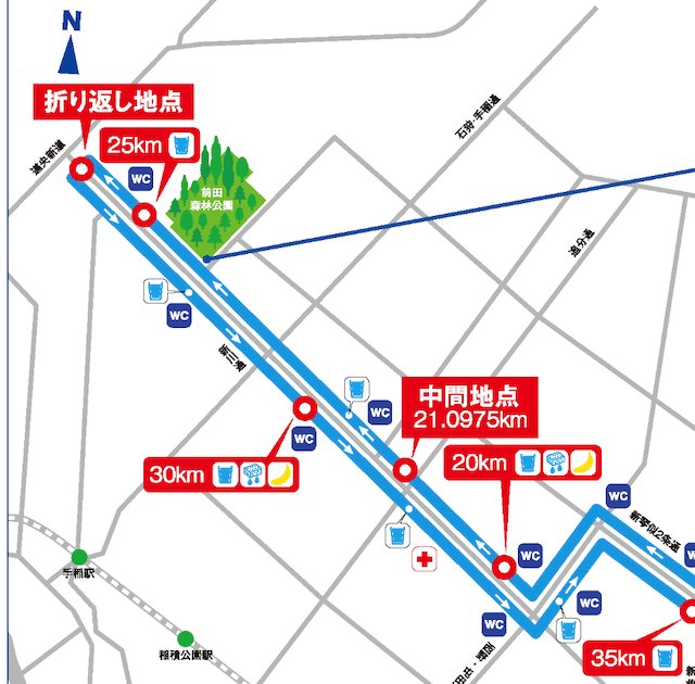 新川通りの折り返し地点手前にある前田森林公園には「ランナーサポートエリア」というものが設置され、どうやらそれは大きめのエイドらしいです。なんか、美味しいものを食べさせてもらえそうな期待もあり、まずはそこに行ってみることにしました。
