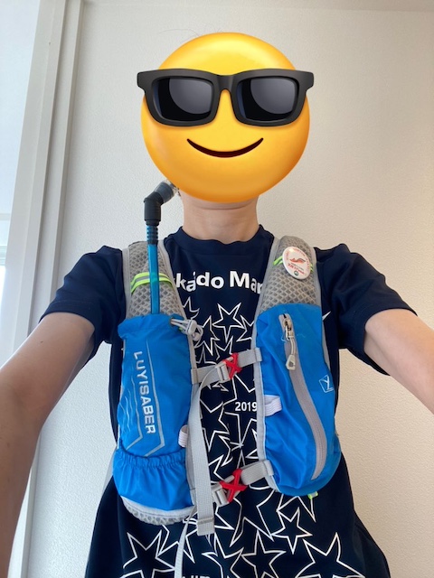 ふだんは、下の写真のようにランニングベストを背負って走ります。格好だけ見ると、トレイルやウルトラマラソンに出るのか?!というくらいの重装備ですが、買い物がてら近所まで走る時もこれです。