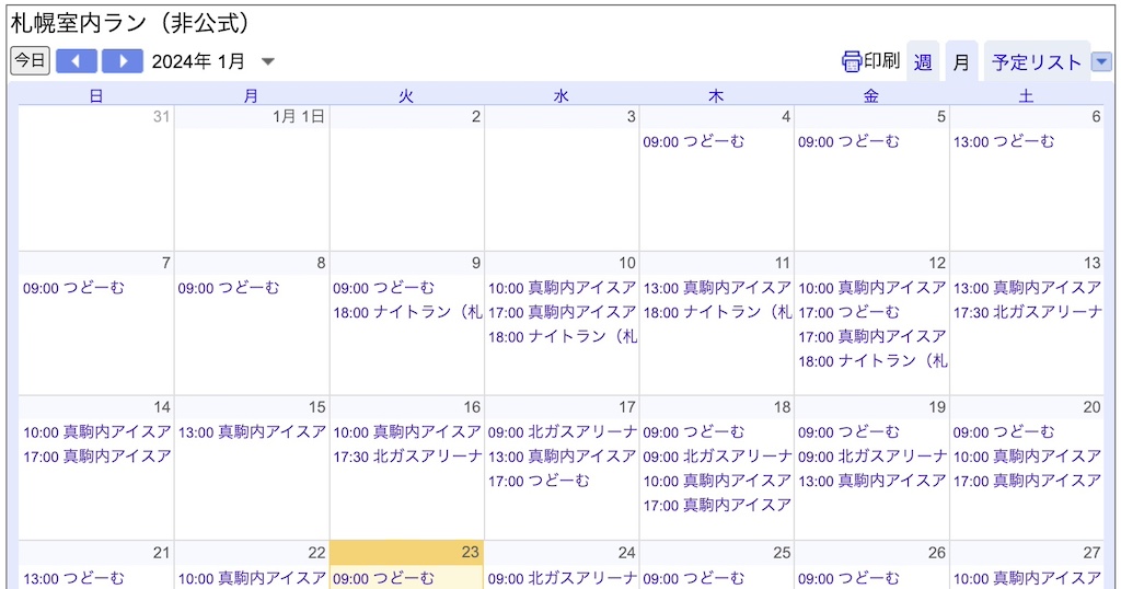 このカレンダーは以下の室内ランの利用可能スケジュールを個人的にまとめたものです。間違っている場合もありますので、必ずご自分で各施設の公式サイトを確認してから、ご利用ください。